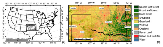 (a) Region of interest in the Midwestern USA, where soil moisture gap-filling methods were performed; (b) Land cover types over the region of interest (30 m), level 1 NALCMS classification [33].