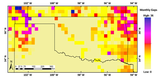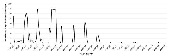 An important step in preparing the soil moisture data for analysis is identifying the most relevant summary statistics, such as the mean or median. The median value is more useful when data are concentrated on a brief period of the month (because of long data gaps) with an uneven distribution of data [34]. However, mean monthly soil moisture values showed higher correlation with the tested set of geophysical covariates (Supplementary Material S1). For our region of interest, Figure 2 shows the spatial distribution and number of soil moisture gaps (ESA CCI soil moisture version 4.5) during the study period (January 2000 to September 2012) where no mean values were calculated due to a lack of valid pixels. A pixel is considered valid when soil moisture estimates are available from the ESA CCI product over the region of interest. Figure 3 shows the number of gaps per monthly layer, regarding 741 pixels of 0.25 × 0.25 degrees in our region of interest.