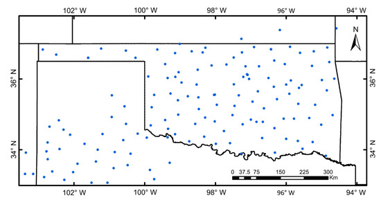 All NASMD stations available for the study period (157). Stations are broadly distributed over Oklahoma and northern Texas; however, ground-truth data are scarce over the surrounding states within the region of interest.