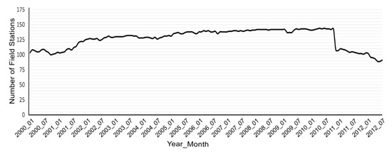 First, we established a reference correlation value between original satellite-derived soil moisture and data from the NASMD. We extracted all available data from NASMD over the region of interest for each month during the study period and calculated the mean monthly value of soil moisture at 5-cm depth for each field station, thus capturing as much variation as possible from the upper soil layers sensed by the satellites. We tested the correlation between satellite-derived values over each spatially correspondent pixel with soil moisture information derived from the NASMD. This process was performed over the layers using 100%, 75%, and 50% of available valid pixels. When there was more than one NASMD station within one corresponding pixel of satellite-derived soil moisture, every station value from within the pixel area was accounted for in the correlation analysis with the satellite data. Overall, we used data from 157 stations in the months with the highest availability of field soil moisture records. The use of all NASMD available stations allowed us to retain the overall observation-estimation pairs. Figure 5 shows the distribution of available NASMD stations over the region of interest for the entire study period. Figure 6 shows the number of NASMD stations used in each month to validate the outputs of our models. Across the entire study period, all available stations provided 19,007 points to compare satellite-derived soil moisture estimates and ground-truth data.