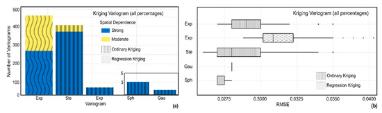(a) Most fitted variogram models used to predict soil moisture; 459 models generated for both OK and RK in 153 monthly layers derived from all percentages (100%, 75%, and 50%) of valid pixels; (b) Boxplots of the RMSE for each predicted layer using the selected variograms.