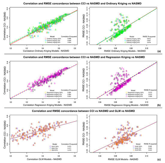 R-squared values showing the concordance between the reference validation (CCI-NASMD) and the validation of proposed gap-filling methods with NASMD. Each point represents one month, using 100%, 70%, or 50% of the available data, with the percentage indicated by the shape used. (a) Validation of ordinary kriging with NASMD, with correlation on the left and RMSE on the right; (b) Validation of regression kriging with NASMD, with correlation on the left and RMSE on the right; (c) Validation of GLM with NASMD, with correlation on the left and RMSE on the right. Regression lines between correlated datasets are shown in each plot.