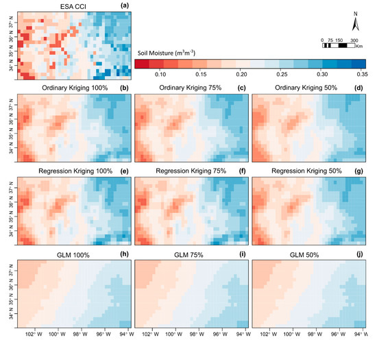 Mean soil moisture values during the study period (January 2000–September 2012) over the region of interest. (a) Mean values of original ESA CCI soil moisture estimates; no gap-filling methods applied; (b) Soil moisture mean values modeled using OK and 100% of available valid data; (c) Soil moisture mean values modeled using OK and 75% of available valid data; (d) Soil moisture mean values modeled using OK and 50% of available valid data; (e) Soil moisture mean values modeled using RK and 100% of available valid data; (f) Soil moisture mean values modeled using RK and 75% of available valid data; (g) Soil moisture mean values modeled using RK and 50% of available valid data; (h) Soil moisture mean values modeled using GLM and 100% of available valid data; (i) Soil moisture mean values modeled using GLM and 75% of available valid data; (j) Soil moisture mean values modeled using GLM and 50% of available valid data.