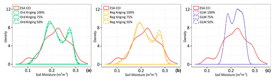 Finally, we found that the density distribution describing the mean soil moisture values during the study period in the original ESA CCI was better reproduced by the OK and RK approaches. The performances of OK and RK were similar, either using 100%, 75%, or 50% of available valid data (Figure 11a,b). In contrast, the GLM density distribution substantially deviated from the values of the original ESA CCI product (Figure 11c).