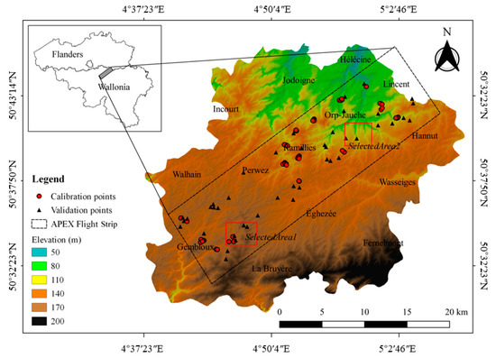 The study region, over which APEX hyperspectral images were acquired in 2013, 2015 and 2018, is located in the center of the Belgian loam belt (Figure 1). The area is a ca. 230 km2 strip (SW corner: 50.59N, 4.69E; NE corner: 50.70N, 5.11E) from Gembloux to Lincent. It is characterized by geological formations of the Quaternary and Tertiary Eras, with loess-derived haplic Luvisols (IUSS Working Group WRB, 2015) as the major soil type. The climate in this region is temperate oceanic with mean temperatures between 2.3 °C (January) and 17.8 °C (July), and the mean annual precipitation is 790 mm, which is evenly distributed throughout the year [30]. Cropland is the dominant land use type with productive silt loam soils on a rolling topography. Main crops are winter wheat, winter barley, sugar beet, maize and potatoes. SOC content in this region is decreasing due to the intensive agriculture, making it increasingly vulnerable to soil degradation [11].