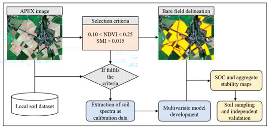 where the normalized difference between the reflectance at wavelength 2049 and 2193 nm was used to indicate the soil moisture level. A higher SMI value indicates a drier soil surface. A SMI threshold of 0.015 was adopted from Diek et al. [24] to indicate dry conditions. SMI values above this threshold were assumed not to be disturbed by the noise caused by variation in topsoil moisture. Next, to determine the meaningful threshold for NDVI that is most representative of the bare soils, 100 optimally-conditioned bare fields were visually assessed and selected from the APEX images using the RGB bands, and the NDVI range of these fields were used as thresholds. Consequently, the NDVI threshold was set between 0.10 and 0.22. Lastly, the two pre-defined spectral indexes were used as bare soil selection criteria and applied to the entire study area. A bare soil field was delineated if the entire field fulfilled the criteria while at the same time excluding road networks and built-up areas. Thus, 788 fields (41.2 km2) were extracted from the raw APEX images, covering approximately 18% of the study area.