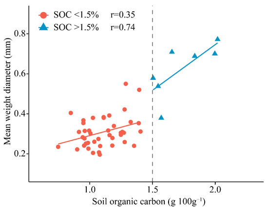 Scatterplot of soil mean weight diameter (MWD) versus soil organic carbon (SOC). We divided the data into two parts using a SOC threshold of 1.5 g 100 g−1. Solid lines for both parts were fitted by linear regression.