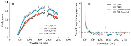 (a) Comparison between extracted APEX spectra and field ASD spectra at two locations with distinct SOC contents. (b) Variable importance projection (VIP) in partial least squares regression (PLSR) model for MWD and SOC using the extracted APEX spectra. The APEX curves (MWD_APEX and SOC_APEX) were compared to two other independent VIP curves generated using the laboratory ASD spectra (adapted from Shi et al. [29]), which are resampled to the same spectral resolution as the APEX spectra. Spectral wavelength with VIP value greater than one was considered significant for the PLSR model.