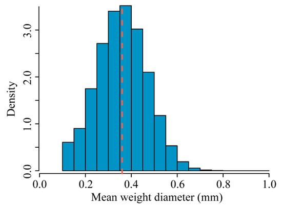 Histogram of the predicted soil mean weight diameter (MWD) across the entire study region. The vertical dashed line in red represents the mean MWD.