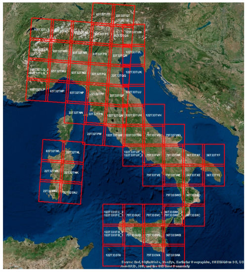 The Sentinel-2 multispectral instrument performs measurements in 13 spectral bands with spatial resolutions ranging from 10 to 60 m. The spectral channels include four bands at 10 m spatial resolution, six bands at 20 m spatial resolution, and three bands at 60 m spatial resolution. S2 products are available as elementary granules, also called tiles, of fixed size (100 × 100 km2), along with a single orbit. A granule contains all possible spectral bands, and it is the minimum indivisible partition of a product. Figure 1 shows the S2 tiles that cover the Italian territory and are processed by AUTOBAM; their number is 70 subdivided along six orbits. It takes five days to totally cover Italy with the data provided by the S2A and S2B satellites.