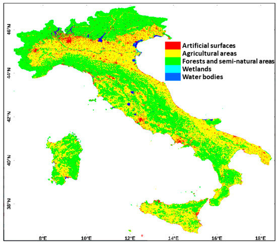 According to the CORINE land cover (CLC) inventory, 34% of the entire Italian territory is covered forest and semi-natural areas. More precisely, based on the CLC level 4 nomenclature, it was found that the class of forest with the higher percentage (7%) with respect to the entire Italian territory corresponds to the broad-leaved forests with continuous canopy on mire, followed by broad-leaved forests with discontinuous canopy, not on mire, broad-leaved forests with discontinuous canopy on mire, and plantation of broad-leaved forests all at 3%, respectively.