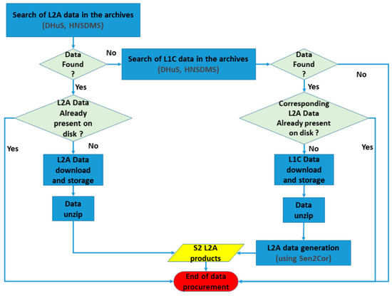 AUTOBAM includes a script to search, download, and unzip S2 L2A data written in Python language. Its scheme is shown in Figure 3. It takes advantage of the freely available Sentinelsat tool (https://pypi.org/project/sentinelsat/) that enables users to automatically search and download Sentinel-1/2/3 data. For the script, the following Sentinelsat inputs were used: 1) URL of the archive from which S2 data are downloaded; 2) start date; 3) tile code identifier; 4) product type (S2-L2A in this case); 5) maximum cloud cover. The two archives introduced in Section 2.1 (DHuS and HNSDMS) are sequentially queried. For each query, the codes used to identify the tiles that cover the Italian territory, shown in Figure 1, are included in the search parameters of the Sentinelsat tool. The maximum cloud cover percentage was fixed at 40%; hence, S2 images with a cloud cover greater than 40% are discarded. The script is automatically executed every day and is scheduled to run every hour, starting from 15:00 UTC until 05:00 UTC of the next day, thus dealing with possible delays in the availability of the S2 data in the archives. Looking at Figure 3, it can be noted that the possibility that, for any reason, L2A data are not found is managed by searching for lower level (L1C) data and then running a freely available software named Sen2Cor, developed by the European Space Agency (ESA), which allows users to generate L2A data from L1C ones.