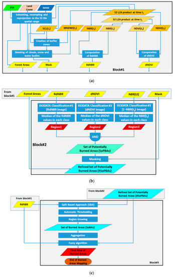 The three-block diagram of the burned area (BA) mapping algorithm implemented in AUTOBAM; (a) Block#1, (b) Block#2, and (c) Block#3. The diagram refers to a single S2 tile.
