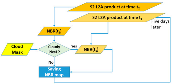 NBR and NDVI maps at time t1 must actually contain, for each pixel, the most recent information about these indices. For this purpose, as shown in Figure 5 for NBR (but it is the same for NDVI), AUTOBAM saves them in S2oldDir to be used five days later as NBR(t1) and NDVI (t1) when a new S2 product for the same tile will be acquired. Before saving NBR(t2) and NDVI (t2), in pixels classified as cloudy at t2, the values of NBR(t2) and NDVI(t2) are replaced by the corresponding values of NBR(t1) and NDVI (t1). A limit of 30 days has been fixed for t2− t1 in order to avoid comparing data acquired at very different times, so that if there is no cloud-free information for over 30 days, an area is not mapped.