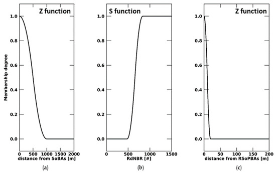 In practice, the fuzzy logic is used in order to find a theoretical framework for including, in the SoBAs, pixels close to this set that have a high value of RdNBR and/or belong to the RSoPBAs. The parameters defining the shape of the functions, shown in Figure 6, have been determined through a trial and error approach in order to fulfill this purpose. By comparing the scales of the horizontal axes of Figure 6a,c, it can be noted that, for the distance from RSoPBAs, the membership degree drops off very quickly (it becomes zero at a distance of only 20 m, i.e., one pixel). Hence, the membership degree according to the distance from the RSoPBAs is such that it is maximum if a pixel belongs to the RSoPBAs and minimum otherwise.