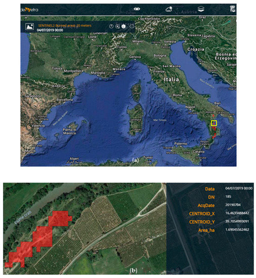 Figure 7 illustrates an example of how a daily BA map is presented to the end-user (Italian DCP) through MyDewetra. Panel (a) shows what appears to the end-user when an operator opens MyDewetra and chooses a day of interest (4 July 2019, in this case). To make the location of the burned areas easily identifiable, it is assigned a red cross to the center of each area. By clicking on one of the red crosses, a window opens (panel (b)), which shows the information listed above.