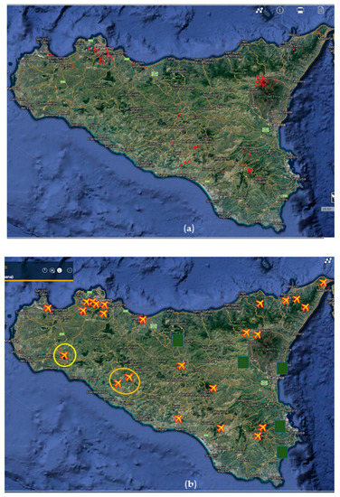 Comparison between (a) zoom on the Sicily region of the map of burned areas generated by AUTOBAM from the S2 acquisition on 6 August 2019, and (b) map derived from the local fire signaling in the period 2–6 August 2019. Red crosses: AUTOBAM-burned areas; yellow airplanes: location of the fires according to local fire signaling. Local signaling not regarding forests are not considered (masked by green boxes in panel (b)). Both maps are available from the MyDewetra platform. Yellow and orange circles highlight the fires reported by local news, which were not detected by AUTOBAM.