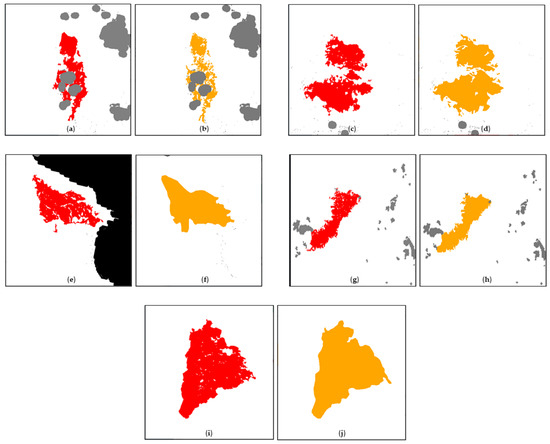 Maps of burned areas derived from AUTOBAM and Copernicus Emergency Management Service (CEMS); (a) AUTOBAM-derived map for the Evia Island event (EMSR306); (b) CEMS-derived map for the Evia Island event (EMSR306); (c) AUTOBAM-derived map for the Tuscany event (EMSR316); (d) CEMS-derived map for the Tuscany event (EMSR316); (e) AUTOBAM-derived map for the Sithonia event (EMSR331); (f) CEMS-derived map for the Sithonia event (EMSR331); (g) AUTOBAM-derived map for the Mount Kenia event (EMSR345); (h) CEMS-derived map for the Mount Kenia event (EMSR345); (i) AUTOBAM-derived map for the Castile and León event (EMSR368); (j) CEMS-derived map for the Castile and León event (EMSR368). Red: BA according to AUTOBAM; orange: BA according to CEMS; white: unburned; black: unclassified (e.g., sea); gray: clouds (enlarged by creating a buffer zone, see Section 3.2.1) according to the scene classification (SCL) included in the level 2A (L2A) products.