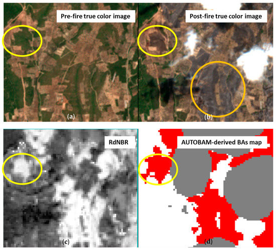 The Evia Island fire is the only test case for which the commission error is quite large, exceeding 25%, even if both OA and κ were high. Although commission error when mapping BA is mainly caused by an inaccurate masking of clouds, cloud shadows, and terrain shadows [12], in this case, it is mainly related to the long interval between the acquisition times of the pre- and post-fire images (note that the same images as those selected by CEMS have been chosen for validation purposes), which exceeded two months (see Section 2.5). Figure 10 shows an area (highlighted by yellow circles), where a quite significant false alarm occurred. By comparing panels (a) and (b), it can be noted that this area was vegetated (green in the true color image) when the pre-fire image was acquired, while it was bare (brown tone in the true color image) at the post-fire acquisition time. This change was evaluated by the CEMS operators as not caused by the fire, likely because the tone of this area is slightly different from that of the core of the BA (orange circle in panel (b)) that tends to be gray in the post-fire image. Hence, a change in the vegetation conditions likely occurred during the time between the two S2 acquisitions. This outcome explains why we limited to 30 days the maximum difference between pre- and post-fire acquisition times (see Section 3.2.1).