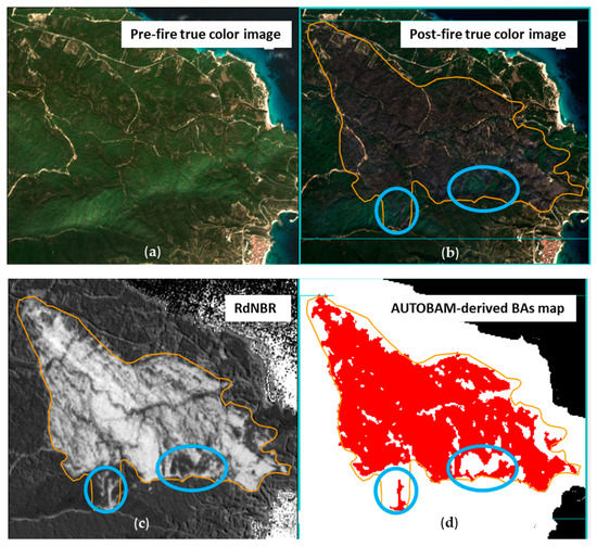 For the Sithonia fire, which caused the damage of about 800 ha of a pine forest, the omission error is around 25%. Looking at Figure 9f, it can be noted that, in this case, the CEMS-derived BA map has no gaps, as if the spectral index used by CEMS to generate the map were totally uniform in the burned area. Looking at Figure 11, (analogous to Figure 10, but for the Sithonia test case), it can be noted that RdNBR is not uniformly high in this area and that the spatial pattern of the AUTOBAM-derived map basically reproduces that of RdNBR. Note that the regions highlighted by the blue circles in Figure 11 (labeled as unburned by AUTOBAM) have a dark green tone in the post-fire image and that RdNBR in these regions assumed even negative values (typical of unburned areas). This justifies the fact that AUTOBAM has not classified these areas as burned. Probably, in these areas, the intensity of the fire caused only low severity damages, so that, as discussed in [50], its effects have not triggered the detection threshold. Furthermore, the fact that the grading map (i.e., that including the degree of severity) provided by CEMS labels these areas as “possibly damaged” confirms the uncertainty of the classification task in this case.