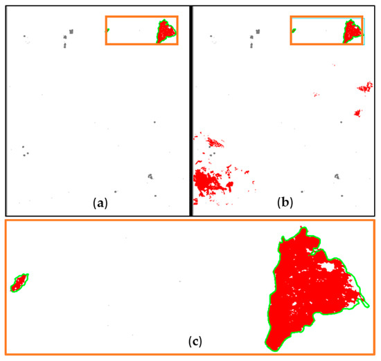 AUTOBAM-burned areas maps for the Castile and León case study; (a) performing the ISODATA classification step; (b) without performing the ISODATA classification step. Green lines represent the perimeter of the CEMS-derived burned areas. The orange box delineates the CEMS-derived area of interest. Panel (c) is a zoom on the CEMS-derived area of interest.