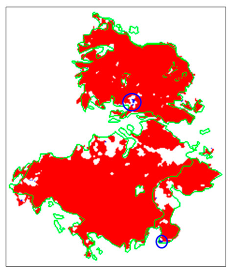 As discussed in Section 3.2.3, the fuzzy logic-based approach performs just a refinement of the BA map aiming at including, in the SoBAs, pixels close to this set that have a high value of RdNBR and/or belong to the RSoPBAs. The use of the fuzzy logic for post-classification purposes was carried out also in [44]. Figure 13 shows the AUTOBAM-derived map of BA for the Tuscany fire, which destroyed 1000 ha of territory, including prevalently forest and olive groves. The pixels colored in blue represented those added to the SoBAs by the fuzzy logic-based algorithm. It can be seen that although only a few pixels were included in the set SoBAs (the biggest sets of pixels are highlighted by blue circles in Figure 13), this inclusion increased the accuracy of the map of BA since the blue pixels were mostly classified as burned by CEMS too. Nonetheless, some areas classified as burned by CEMS and unburned by AUTOBAM remain. In most of these areas, the situation is similar to that discussed when dealing with the Sithonia case study, i.e., the values of RdNBR are not large enough to be above the detection threshold.