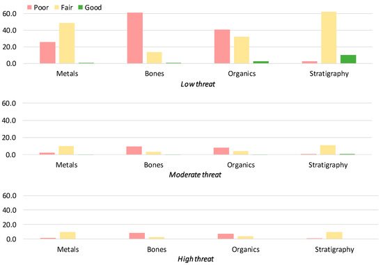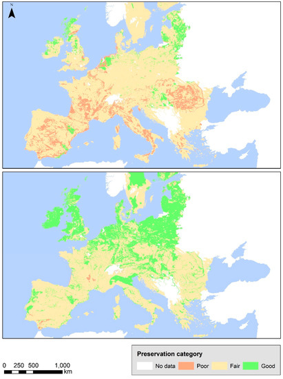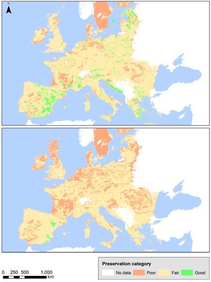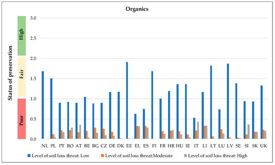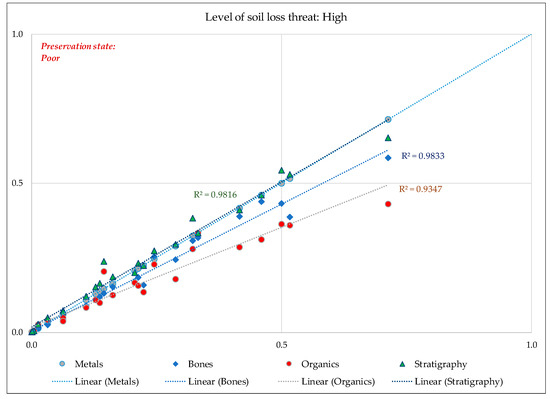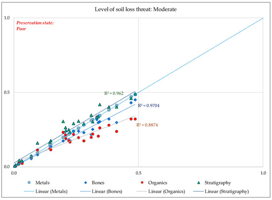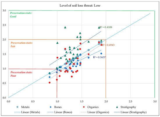 - Remark 3: Areas characterised as low threat from soil erosion present approximately 10% of good preservation capacity, which varies depending on the type of the material.
