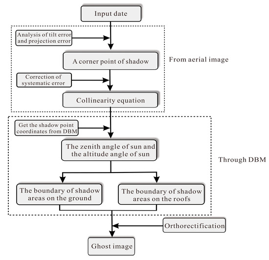 As shown in Figure 4, the method proposed in this paper first selects a corner point of the shadow with a relatively small error in the aerial image through analysis of tilt error and projection error, and then correcting the corner point of shadow through the correction of systematic error. Secondly, the corrected image point coordinates are combined with the mean elevation of the ground from the DBM through the collinearity equation, to determine the unique object point image coordinate on the image plane. When the 3D ground point coordinates are known, the solar zenith angle and the solar altitude angle are also known, and then the boundary coordinates of the shadow areas on the ground and the boundary coordinates of the shadow areas on the roofs can also be determined using the solar zenith angle and the solar altitude angle. Finally, the orthorectified shadow areas in the ghost image are obtained in accordance with the boundary coordinates of shadow areas as obtained through photogrammetric orthorectification.