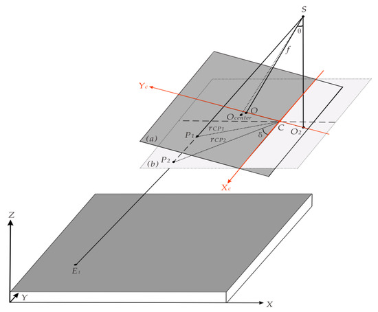 In Figure 5, assuming that the ground is horizontal, and the corner point E1 which is on the shadow boundary is on the ground, a tilted image (a), in which a point E1 on the ground, is taken from the exposure center S, and the image (b) is assumed an ideal horizontal image. A ray from E1 is imaged at P1 on the image (a), and P2 on the image (b). The angle θ is a tilt angle of the image (a), point O and point O2 are the principal point and the image nadir point of image (a), point Ocenter is the geometric center of image (a), point C is the isocenter of image (a), and f is the focal length of the camera. As shown in Figure 5, the line (isometric parallel) where the intersection of the image (a) and image (b) is taken as XC-axis, and the principal line on the image (a) is taken as YC-axis for establishment of the image coordinate system C-XCYC. δ represents the angle between the line CP1 and the XC-axis, the length of line CP1 is defined as rCP1, and the length of CP2 is defined as rCP2.