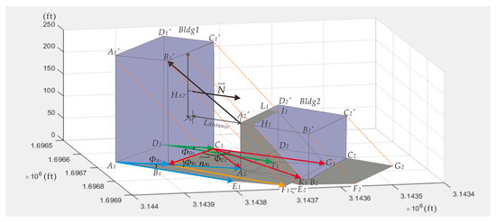 where the coefficients , , and can be determined according to the vector of each corner point from the Bldg1. is a normal vector, which is perpendicular to the plane B1C1C1′B1′. The vector can be represented by the coordinates of point and :
