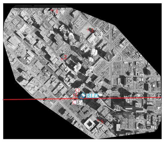 In order to explain the advantages of selecting the shadow corner point EI and to verify the accuracy of the angle α and the angle β, we selected and analyzed the result of the point selection by comparing the other five shadow boundary corner points in the experimental area (see Figure 8). In Figure 8, The BLD is a building which is close to the principal point O. Point 1 is a corner point of shadow corresponding to BLD. Numbers 1–4 are the other four corner points of shadow which are arbitrarily selected in the experimental area.