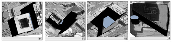 The corner point coordinates of the shadow boundary projected on the ground in the DBM are derived from the solar zenith angle α and the solar altitude angle β according to Equations (5)–(7). As seen from Figure 9, a1, b1, c1, and d1 are the shadow areas from the four independent buildings in the DBM.