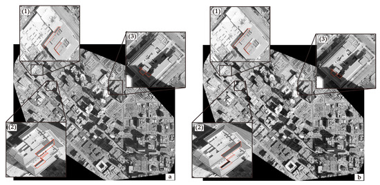 Figure 14b depicts a result that is generated by using our method. The red frames are only the markers to highlight or focus the areas on Figure 14a,b, just to compare and show the difference between a ghost image which is not orthorectified and the results of our method. Comparing Figure 14a,b, we observed the significant changes in the roof shadow areas marked by red frames. It is to be noted that the shadow area on the horizontal roof after the orthorectification does not overlap, and shadow area of the buildings having inclined roof has increased significantly. This is because the building shadows in Figure 14a are corrected by the traditional orthorectification method, and there are overlapping areas on the roofs, due to which some of the shadows of roofs cannot be completely displayed. Figure 14b shows the improvements in the image after using the improved orthorectification method. It is evident from Figure 14b that the shadow areas on the inclined roofs and horizontal roofs are corrected and have improved after orthorectification.