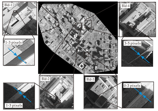 In Figure 15, we superimposed the shadow boundaries which are orthorectificated onto the original ghost image and statistically analyzed their accuracy by presenting four magnified buildings as examples. It can be observed that Bld-1, Bld-2, Bld-3, and Bld-4 have offsets of 1–3, 1–3, 0–3, and 3–5 pixels, respectively. Therefore, an average offset of 1.0–3 pixels was found.