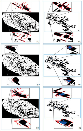 (3) Comparison of Figure 16e with Figure 16f: Figure 16e uses the traditional shadow detection method based on features of the shadow to simultaneously detect the shadows of building on the roofs and on the grounds. The result shows that the proposed method can not only greatly improve the integrity of the detection results, but also can simultaneously detect the shadows of building on the roofs and on the grounds.