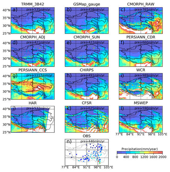 Spatial patterns of multi-year mean annual precipitation (2003–2010) based on the following datasets: (a) Tropical Rainfall Measuring Mission Multi-satellite Precipitation Analysis Version 7 (TRMM_3B42 V7); (b) Global Satellite Mapping of Precipitation with Gauge Adjusted (GSMaP_GAUGE); (c) Climate Prediction Center Morphing Technique origin version (CMORPH_RAW); (d) Climate Prediction Center Morphing Technique with bias-correction (CMORPH_ADJ); (e) Climate Prediction Center Morphing Technique blended by Shuai Sun (CMORPH_SUN); (f) Precipitation Estimation from Remotely Sensed Information using Artificial Neural Networks-Climate Data Record (PERSIANN_CDR); (g) Precipitation Estimation from Remotely Sensed Information using Artificial Neural Networks-Cloud Classification System (PERSIANN_CCS); (h) Climate Hazards Group Infrared Precipitation with Stations (CHIRPS); (i) Western China Reanalysis (WCR); (j) High Asia Reanalysis (HAR); (k) NCEP Climate Forecast System Reanalysis (CFSR); (l) Multi-Source Weighted-Ensemble Precipitation Version 1.0 (MSWEP V1); (n) rain gauge observations. The “pre” in each subplot indicates the multiyear mean annual precipitation (unit: mm/year), which was calculated by 83 stations from each product interpolation.