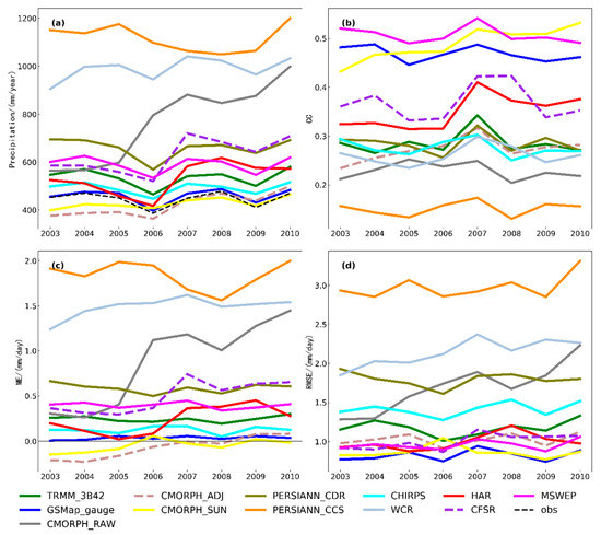 On an interannual scale, great differences were obvious between products and rain gauges (Figure 3a). The GSMaP_GAUGE was closest to the observations. In contrast, PERSIANN_CCS, and WCR exhibited the largest biases. CMORH_ADJ, and CMORPH_SUN slightly underestimated precipitation from 2003–2005. After 2006, the two products were close to observation. This is because CMORPH_SUN originated from CMORPH_ADJ, which blends more surface rain gauges during production. Meanwhile, TRMM_3B42 and CHIRPS overestimated precipitation by <100 mm annually. In addition, CFSR and MSWEP overestimated precipitation by 200 mm annually. PERSIANN_CCS dataset also resulted in overestimation. Although WCR overestimated precipitation, it could still capture the variability of the change in precipitation over time. HAR performed better than WCR with obvious overestimation of precipitation after 2006.