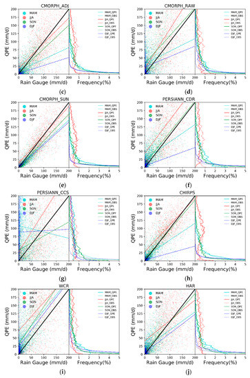 ME in most products was greater in the warm season (May–August; Figure 5c). In each month, ME in PERSIANN_CCS, WCR, CMORPH_RAW, and PERSIANN_CDR was over 20 mm while the ME for other products was less than 20 mm. The CMORPH_ADJ and CMORPH_SUN datasets had a negative ME, and the ME in GSMaP_GAUGE was almost zero. The temporal pattern of RMSE was basically the same with a greater RMSE in the warm season (May–September; Figure 5d). With a precipitation intensity of 50–150 mm, RMSE in PERSIANN_CCS and WCR were greater than the other datasets. GSMaP_GAUGE had a relatively small annual RMSE throughout the year, especially in winter (less than 20 mm/month).