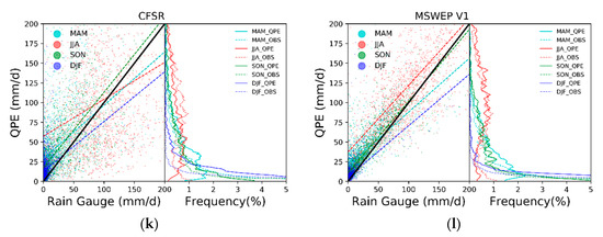 Most products overestimated and underestimated the intensity of precipitation of heavy and relatively light rain, respectively (Figure 4). However, GSMaP_GAUGE (b), CMORPH_ADJ (c), and CHIRPS (h) overestimated light rain and underestimated moderate and heavy rain. In spring, WCR (i) overestimated precipitation intensity. CMORPH_SUN (e) showed a slight underestimation of precipitation intensity. The QPE in products exhibited a general overestimation of precipitation in summer; this was especially true for TRMM_3B42 (a), CMORPH_RAW (d), PERSIANN_CDR (f), PERSIANN_CCS (g), WCR (i), and MSWEP (l). In addition, other QPEs overestimated heavy rain, while underestimating light and moderate rain. In autumn, the bias in QPE and observation was the smallest of all seasons. GSMaP_GAUGE, CMORPH_ADJ, and CMORPH_SUN underestimated precipitation intensity in all bins, which can be compared with overestimation of CMORPH_RAW, WCR, and CFSR (k). In winter, except for PERSIANN_CCS and WCR, other QPEs overestimated the precipitation during light rain events, and underestimated it during moderate and heavy rain. The frequency of precipitation intensity of TRMM_3B42, GSMAP_GAUGE, CMORPH_SUN, CHIRPS, and MSWEP had a similar pattern with small bias when compared with observations. Bias between QPE and observation was present in summer and winter. For precipitation intensity, QPE overestimates light and moderate rain and underestimates heavy rain. In winter, the precipitation intensity was normally <25 mm.