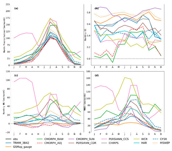 Statistical metrics of precipitation datasetes on the monthly scale. (a) Monthly precipitation; (b) monthly correlation coefficient (CC); (c) monthly mean error (ME); (d) monthly root mean square error (RMSE).