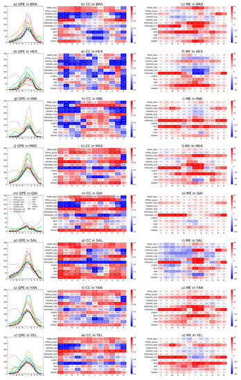 Statistical metrics of monthly precipitation in eight basins of the Qinghai-Tibet Plateau. The quantitative precipitation estimates (QPEs), Correlation coefficients (CCs), and mean error (MEs) are shown respectively in eight river basins as follows: (a–c) Brahmaputra, BRA; (d–f) Hei, HEX; (g–i) Inner Tibetan Plateau, INN; (j–l) Mekong River Basin, MEK; (m–o) Salween River, SAL; (p–r) Qaidam Basin, QAI; (s–u) Yangtze River Basin, YAN; (v–x) Yellow, YEL.
