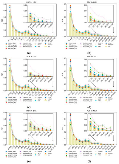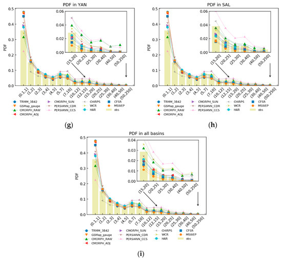 The probability density function of precipitation in eight basins of the Qinghai-Tibet Plateau.The river basins include: (a) Hei River Basin (HEX); (b) Inner Tibetan Plateau (INN); (c) Qaidam Basin (QAI); (d) Yellow River Basin (YEL); (e) Brahmaputra River Basin (BRA); (f) Mekong River Basin (MEK); (g) Yangtgz River Basin (YAN); (h) Salween River Basin (SAL); (i) all eight river basins.
