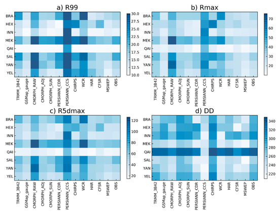 Most products overestimated R99 more than the observations did (Figure 8a). Most products performed better in the INN and QAI basins than other basins. CMORPH_RAW, PERSIANN_CCS, and WCR generated a larger value of R99 than that of other products. Most products maintained a similar intensity for Rmax when compared with Rmax of observation (Figure 8b), with the exception of CMORPH_RAW, and PERSIANN_CCS. This illustrates that most products could capture the daily extreme precipitation events, but overestimated their intensity. R5dmax (Figure 8c) had the same pattern as Rmax. In the MEK Basin, R5dmax was greater than in the other basins. The DD in CMORPH_RAW, PERSIANN_CCS, WCR, and MSWEP had lower values than for other products (Figure 8d). In addition, these products underestimated R5dmax in the MEK, SAL, and YAN basins than in other basins.
