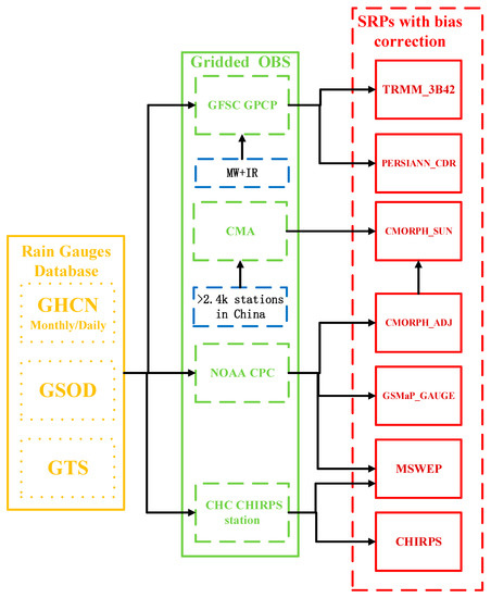 In this study, there are still some limitations. The relationship between observation and SRPs with bias correction in Figure 9 is summarized from references [36,46,77,78,79,80,81]. All SRPs are bias-corrected by gridded observation. These gridded observations (with the exception of GPCP) are only interpolated by rain gauges from surface rain gauge databases, which include Global Telecommunication System (GTS), Global Historical Climate Network (GHCN) and Global Surface Summary of the Day (GSOD). Therefore, these SRPs shares the same surface rain gauge database for bias correction. The different performances come from difference between the products’ satellite sources and precipitation retrieval algorithms. However, the number of rain gauges in these rain gauge databases and CMA’s database are 46 stations and 143 stations, respectively. The CMA’s database includes those rain gauges (46 stations) used in the SRPs’ bias correction. Thus, it should be cautious that the evaluation in this study is not completely independent, especially CMORPH_SUN. To avoid this evaluation problem, the reference observation could be used the proxy gridded precipitation (e.g., precipitation retrieved from soil moisture [82]), and the evaluation method could be used in the hydrological model (e.g., HBV model [Hydrologiska Byråns Vattenbalansavdelning model] [46]) in future.