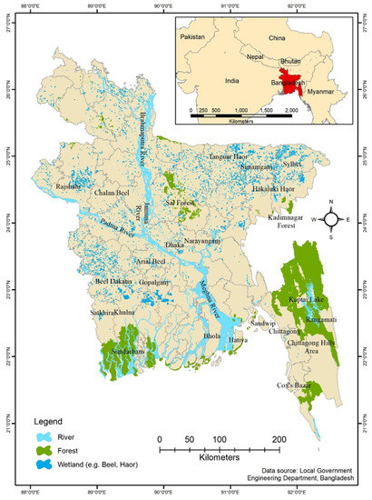 Almost all these wetlands are somehow connected with the GBM river system [17]. In the southwest part, the largest contiguous mangrove forest, the Sundarbans, is located across Bangladesh and India. The forest is 10,000 square kilometers in size but 6000 square kilometers are within Bangladeshi territory. Along with mangrove forest, around 25 thousand square kilometers of forest stretched over the country that include southeastern hilly forests, coastal mangroves, northcentral Sal forests, broadleaved and bamboo forests, and social or village forests [18].