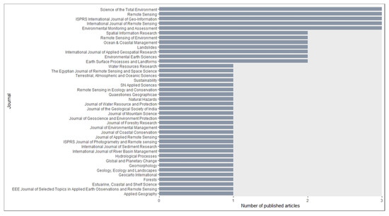 The studies we identified were published in journals with a wide range of scope (see Figure 4). A significant number of articles (37%) were published in remote-sensing or geospatial analysis-focused journals (e.g., Remote Sensing, Remote Sensing of Environment). It indicates that the focus of these articles was the utilization or development of a new remote-sensing approach to examine SDG 15 components. Only 15% of articles were published in subject-specific journals (e.g., Landslides, Forests). Many of these articles used remote sensing techniques as an ancillary tool. Nearly half of all articles were published in interdisciplinary journals (e.g., Science of the Total Environment, Sustainability). The target audience of these journals is often broad and comprises various backgrounds and interests. As such, the articles published in these journals attempted to balance between the technical aspect of remote sensing and its applications.