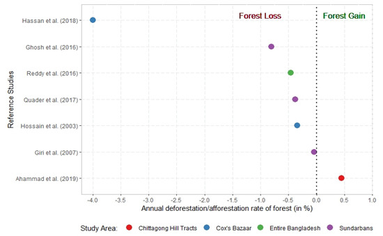 Overall, Bangladesh is losing forests historically at a slow but static rate. Reddy et al. (2016) conducted a historical analysis on the forest cover in Bangladesh and found that from 1930 to 2015, the annual deforestation rate was 0.46% [32]. They found that the deforestation rate was highest (0.75%) during 2006–2014 in their 85-year time period. Unlike Ahammad et al. (2019) [31], they found that hilly areas of southeastern parts are facing more deforestation than other parts, particularly due to agriculture. They also found forest gain in the south-central coastal zone, which can be attributed to the afforestation programs. Figure 5 represents the forest cover loss/gain estimated by different studies.