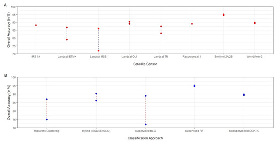 Range of overall classification accuracy in forest related studies based on satellite sensor (A) and classification approach (B).