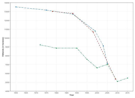 Trend of wetlands change in Dhaka metropolitan area and its surroundings as reported by [39] (blue line), [41] (red line), and [42] (green line).
