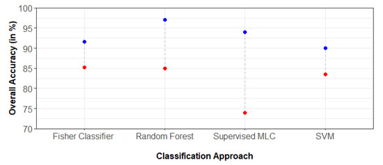 Methodologically, for analyzing wetland or land-use change most of these studies used a two-step workflow: multi-temporal land-use/land-cover (LULC) classification and change detection. Multiple studies used the MLC algorithm [39,41,50,51] which usually performs best when each land use class has Gaussian distribution. However, when both the study area and land use class size are larger, class membership often does not follow the Gaussian distribution. In such cases, the MLC algorithm demonstrates poor performance in accurately classifying LULC classes. Therefore, few studies that focused on analyzing larger and spatially heterogeneous landscapes (e.g., the greater Dhaka city) used other classification algorithms such as Fisher’s classifier [45], support vector machine [46], random forest [42], and a combination of extreme gradient boosting and random forest [52]. Figure 8, generated by summarizing the literature, shows that these algorithms yielded high and less variant classification accuracy than the supervised MLC algorithm (see Appendix C for details).
